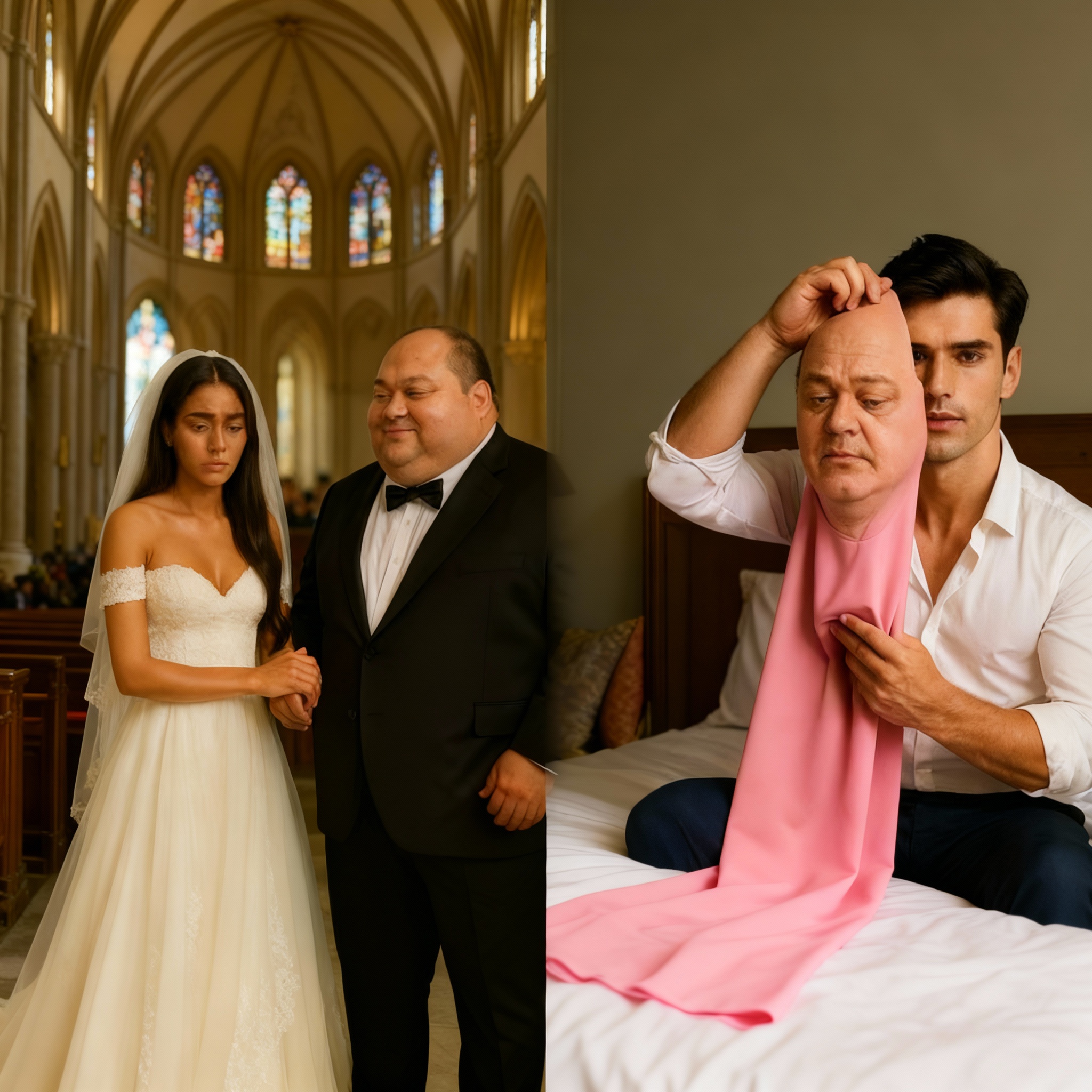 Sa gabi ng kasal, isang nakakagulat na katotohanan ang nabunyag. Dahan-dahang tinanggal ng matabang matandang lalaking may makapal na bigote ang kanyang maskara: pekeng balbas, padding sa tiyan, silikon na balat.