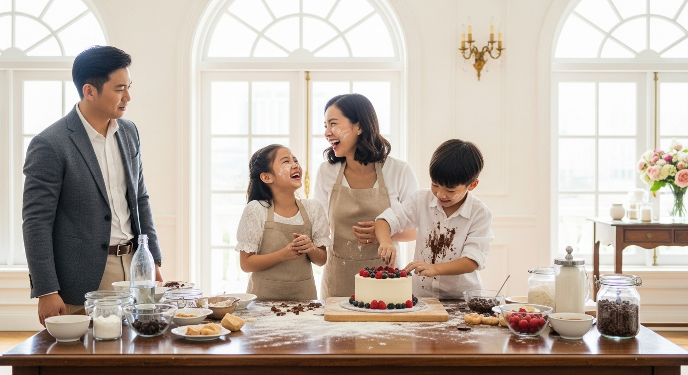 Kalat ang harina sa mesa, may bowls ng frosting, prutas, at amoy tsokolate sa paligid. Nakatayo si Lucas sa ibabaw ng upuan, dekorasyon ng strawberries sa ibabaw ng cake, habang si Maya ay humahagalpak sa tawa sa tabi.