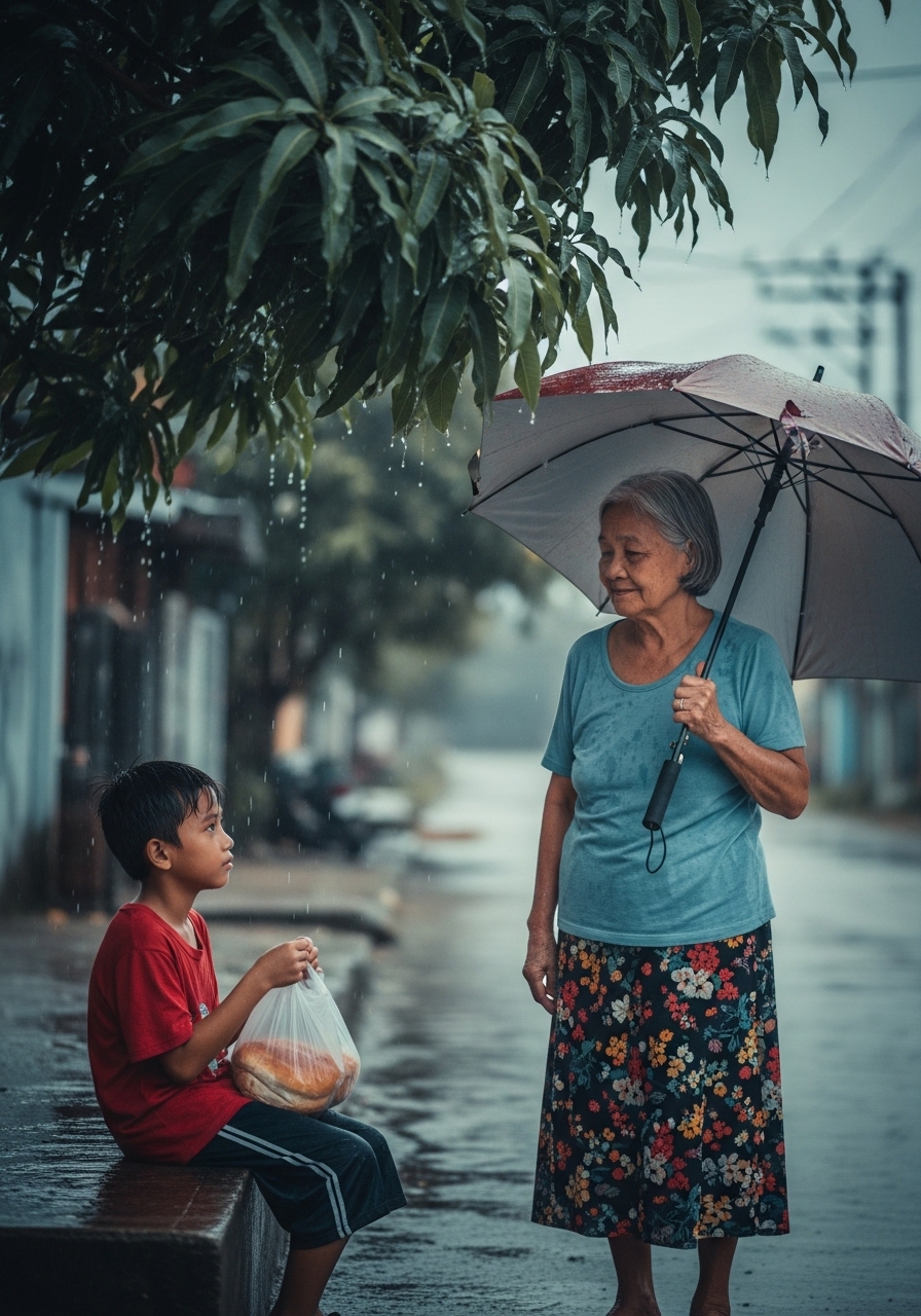 Ngunit isang araw, sa gitna ng ulan, dumating ang isang matandang babae na may bitbit na payong at basket ng gulay. Maputi na ang buhok, may kulubot na balat, ngunit malambing ang mga mata.