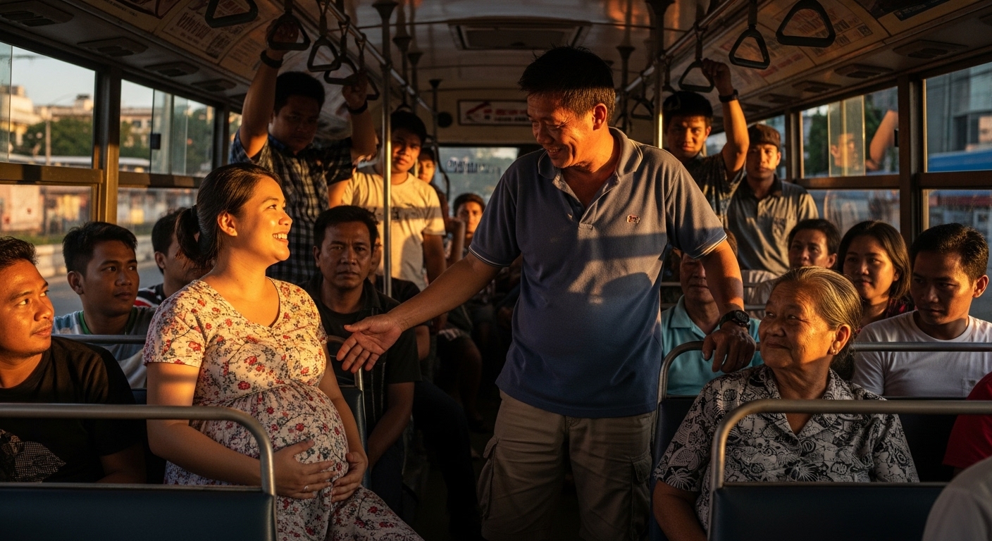 “BINIGAY NIYA ANG UPUAN NIYA SA ISANG BUNTIS — PERO ANG SUMUNOD NA NANGYARI, LAHAT NG NASA BUS AY NATAHIMIK.”