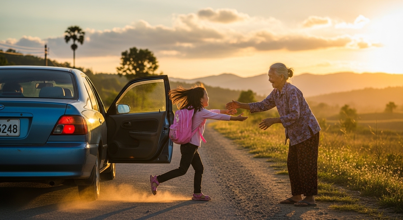 Habang umaandar ang kotse palabas ng baryo, tumingin siya sa bintana—nakita niya si Lola Nena, nakatayo pa rin sa gilid ng kalsada, hawak ang kanyang panyo at pilit na ngumingiti.