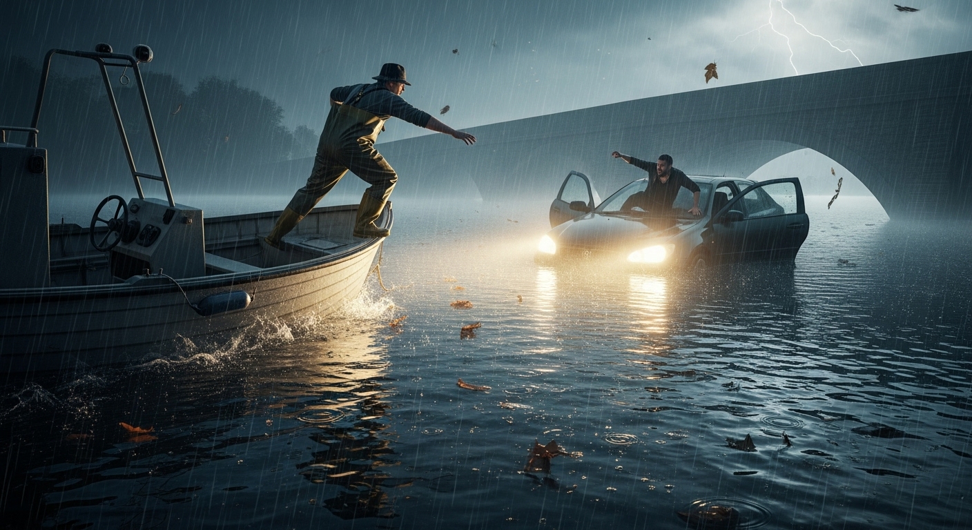 Si Elmer, isang simpleng bangkero sa maliit na bayan sa Batangas, ay pauwi na sana matapos maghatid ng pasahero. Ngunit sa gitna ng dilim, napansin niya ang isang kotseng bumangga sa gilid ng tulay — halos lumubog na sa ilog.
