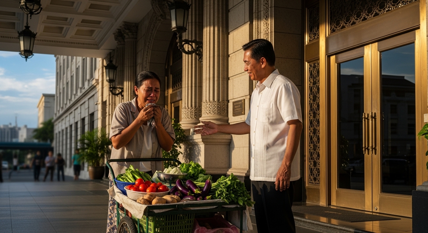 At sa tapat ng marangyang hotel, isang maliit na kariton ng gulay ang naging simbolo ng pag-asa — paalala na minsan, ang tunay na kabaitan ay hindi kailangang magarbo.