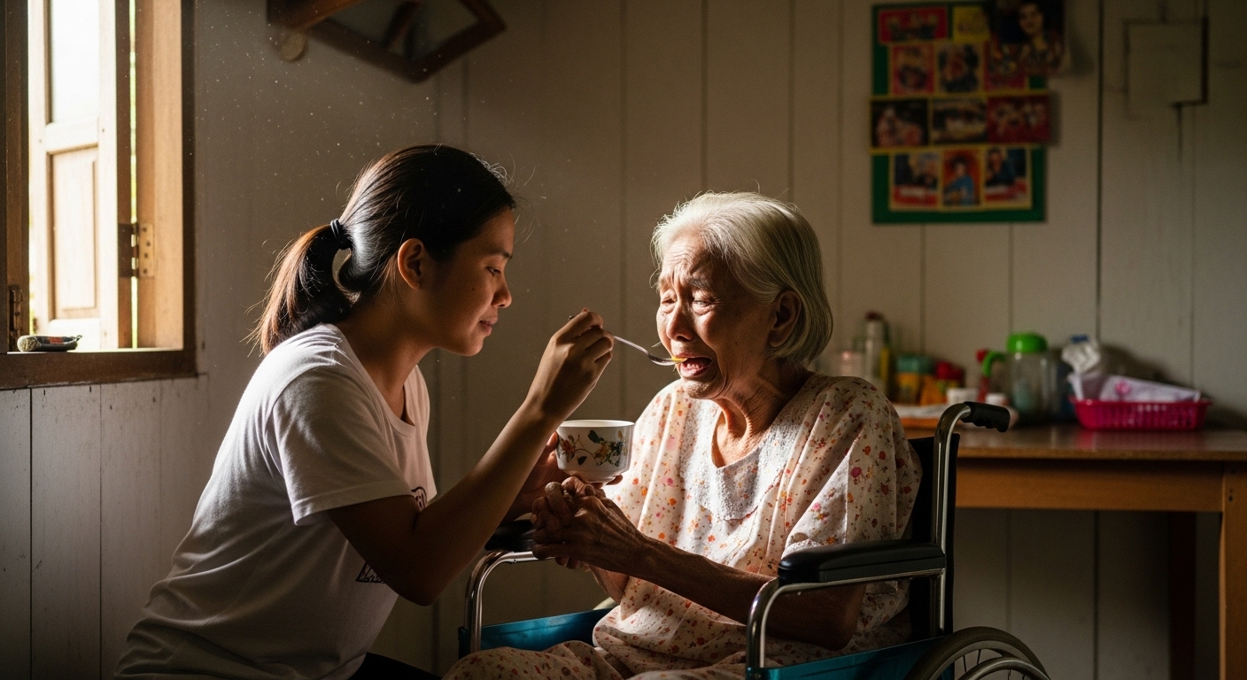 Araw-araw, pinapalitan niya ng damit si Aling Feling. Pinapaliguan, pinapakain, at nilalambingan kahit minsan sinisigawan pa rin siya.