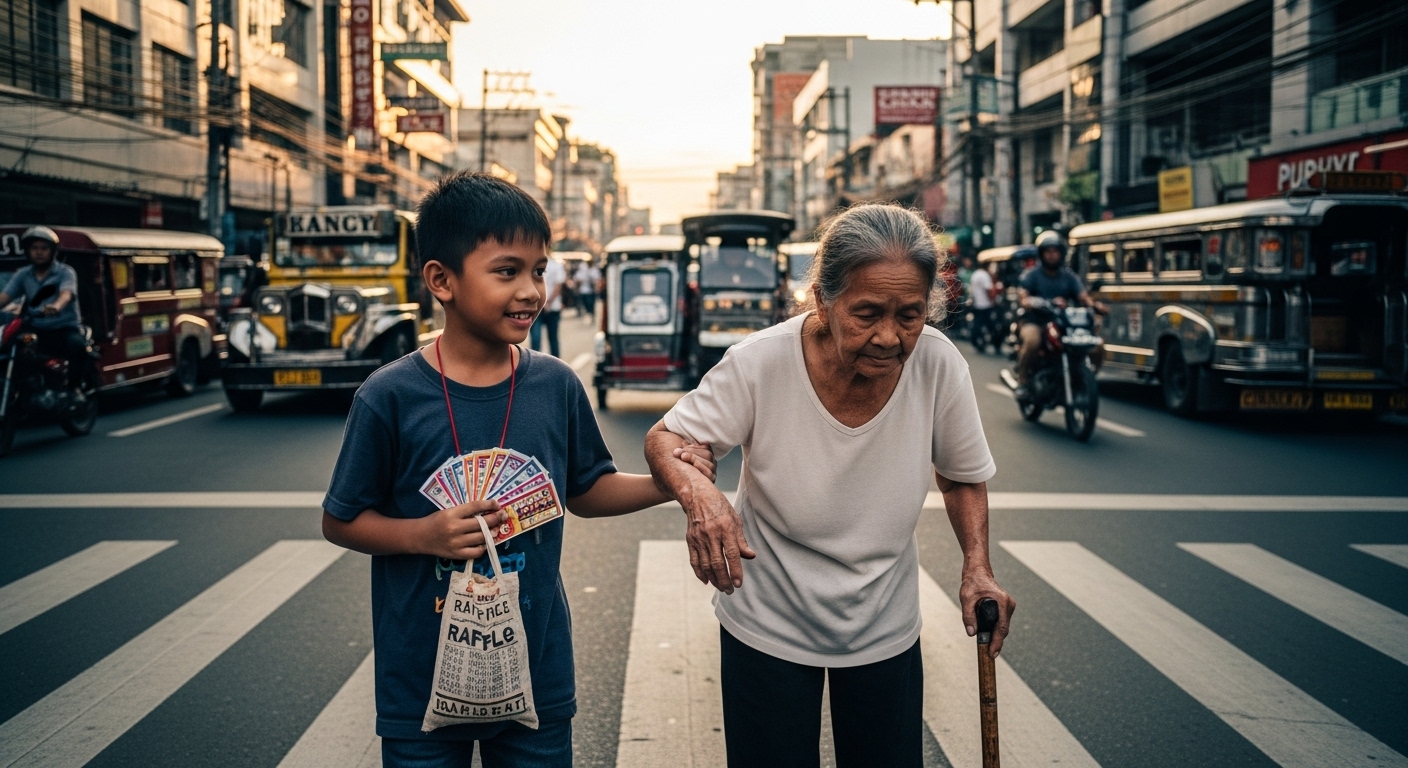 Sa tabi ng overpass, may batang lalaki—si Nico, dose anyos, nagbebenta ng raffle tickets para lang may pambili ng tinapay mamayang gabi.